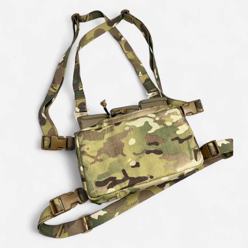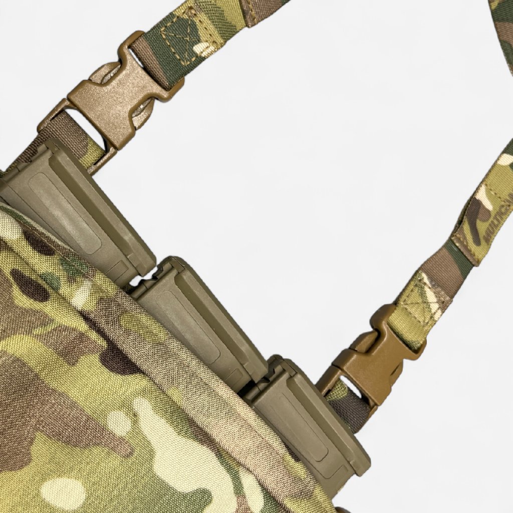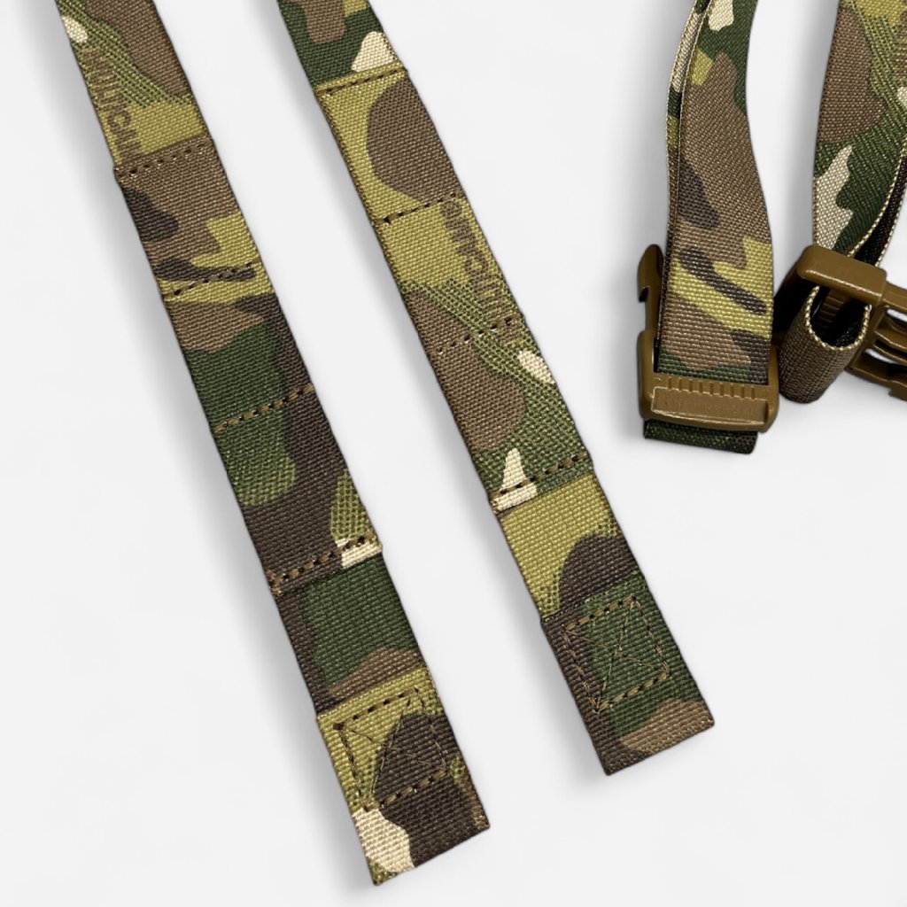 Přední řemení se připojuje k nosiči pomocí plastových spon ITW nebo tzv. G-Hook (je zde pouze tunel na zavěšení spony).