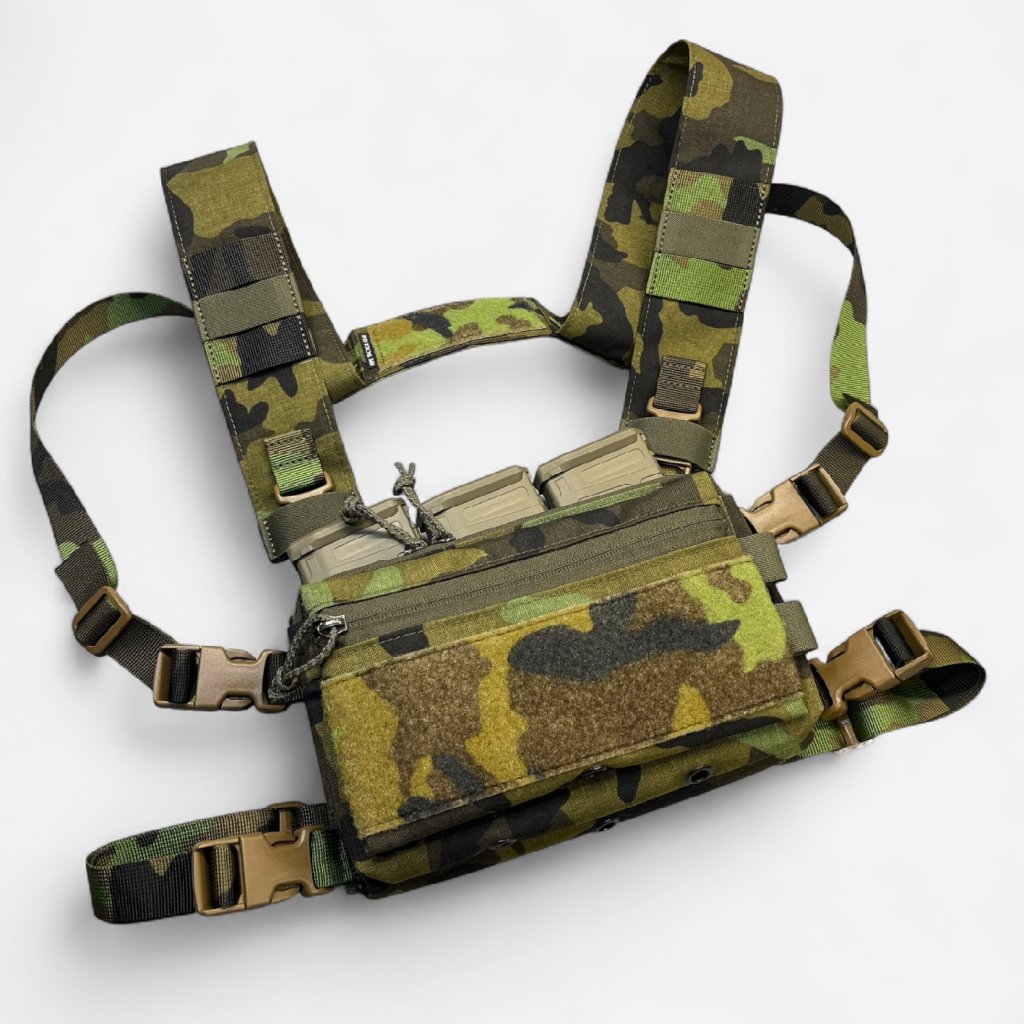 Přední řemení se připojuje k nosiči pomocí nejkvalitnějších plastových spon ITW, přes které vede pruženka (spony jsou na pevno). Nad uchycením jsou tři řady "molle" systému který je složen ze dvou popruhu a jedné elastické pruženky uprostřed. Dále se na řemení v horní častí nachází Velcro o velikosti 10x5 cm, pro vaše týmové, národní či jakékoliv nášivky.