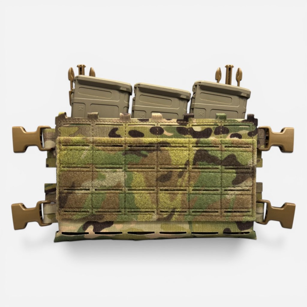 Fixaci váš nosič plátů zajištuje suchý zip a horní spony dle vašeho výběru. Součástí nosiče jsou nylonové inserty pro zásobníky. Platforma je uvnitř podšitá cordurou která ji celkove zpevní.